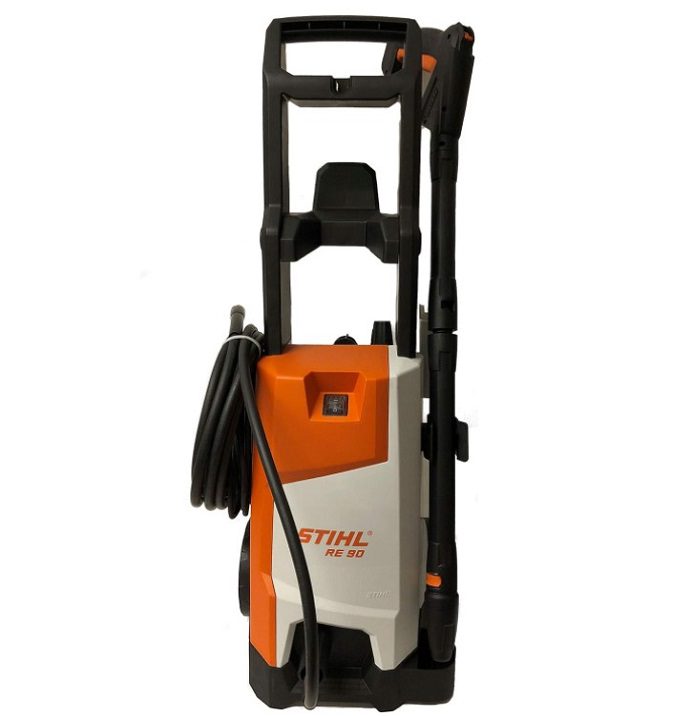 La hidrolimpiadora Stihl RE 90 cuenta con un motor de 1,300 W, alcanzando una presión máxima de 100 bares, ideal para tareas de limpieza en el hogar y el jardín.
